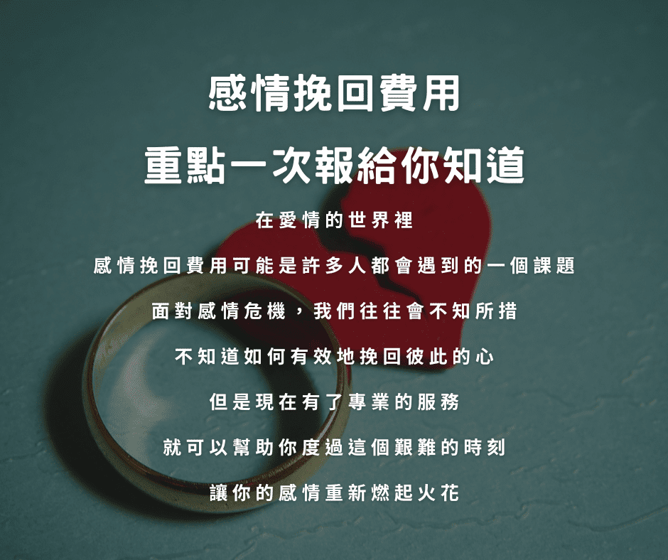在愛情的世界裡,感情挽回費用可能是許多人都會遇到的一個課題。面對感情危機,我們往往會不知所措,不知道如何有效地挽回彼此的心。但是現在有了專業的服務,就可以幫助你度過這個艱難的時刻,讓你的感情重新燃起火花。